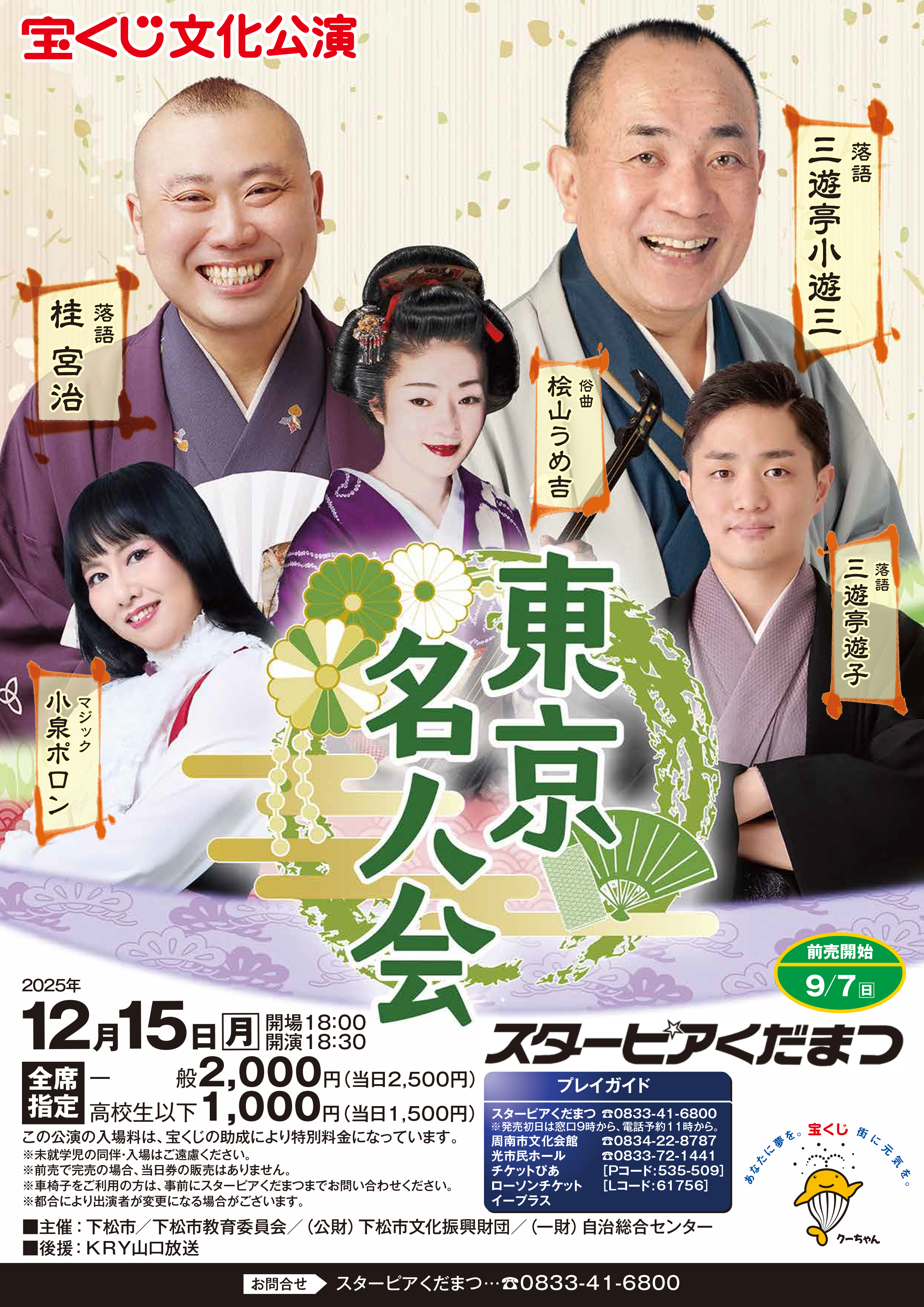 小泉ポロン 桂宮治 三遊亭遊子 桧山うめ吉 三遊亭小遊三会場:スターピアくだまつ 大ホール 詳細はこちら