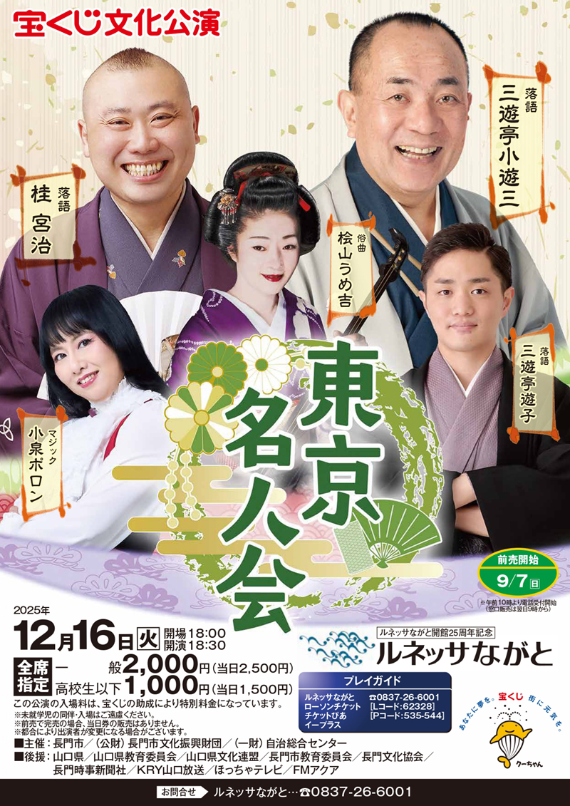 小泉ポロン 桂宮治 三遊亭遊子 桧山うめ吉 三遊亭小遊三会場:山口県立劇場 ルネッサながと 詳細はこちら