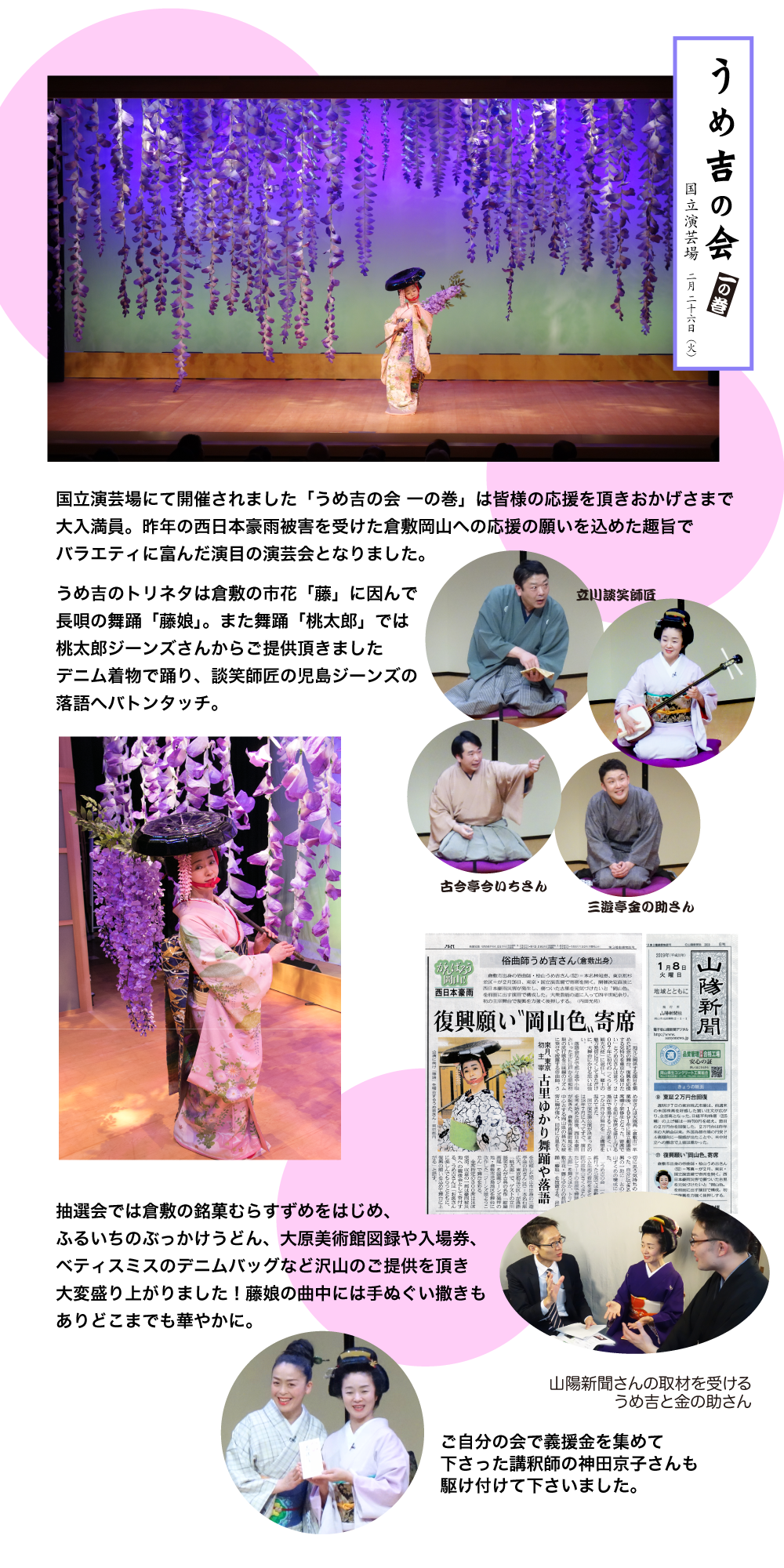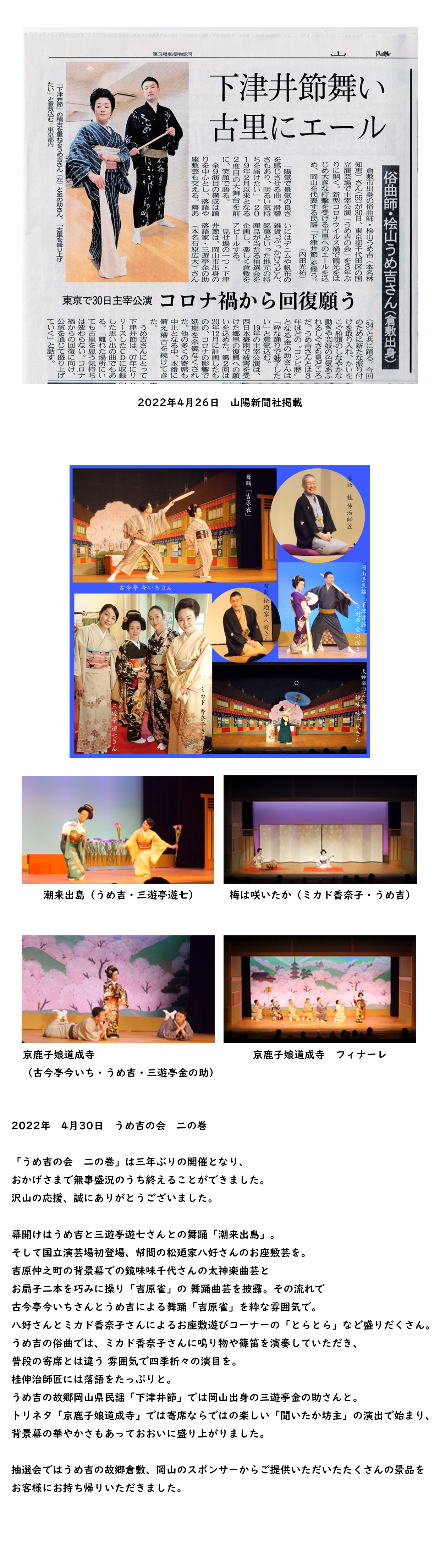 寄席の高座やお座敷のほか、自己のグループ「おてもと社中」、ダンサー「ことぶきシスターズ」を率いてのコンサート、イベント活動を展開。-