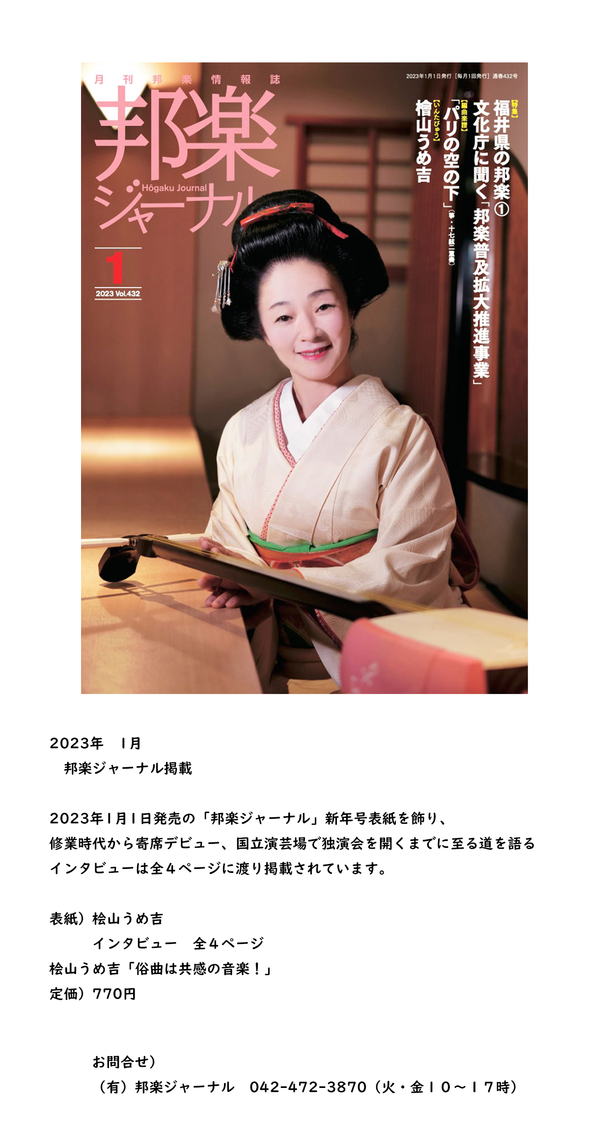 1月 邦楽ジャーナル新年号掲載 桧山うめ吉「俗曲は共感の音楽!」