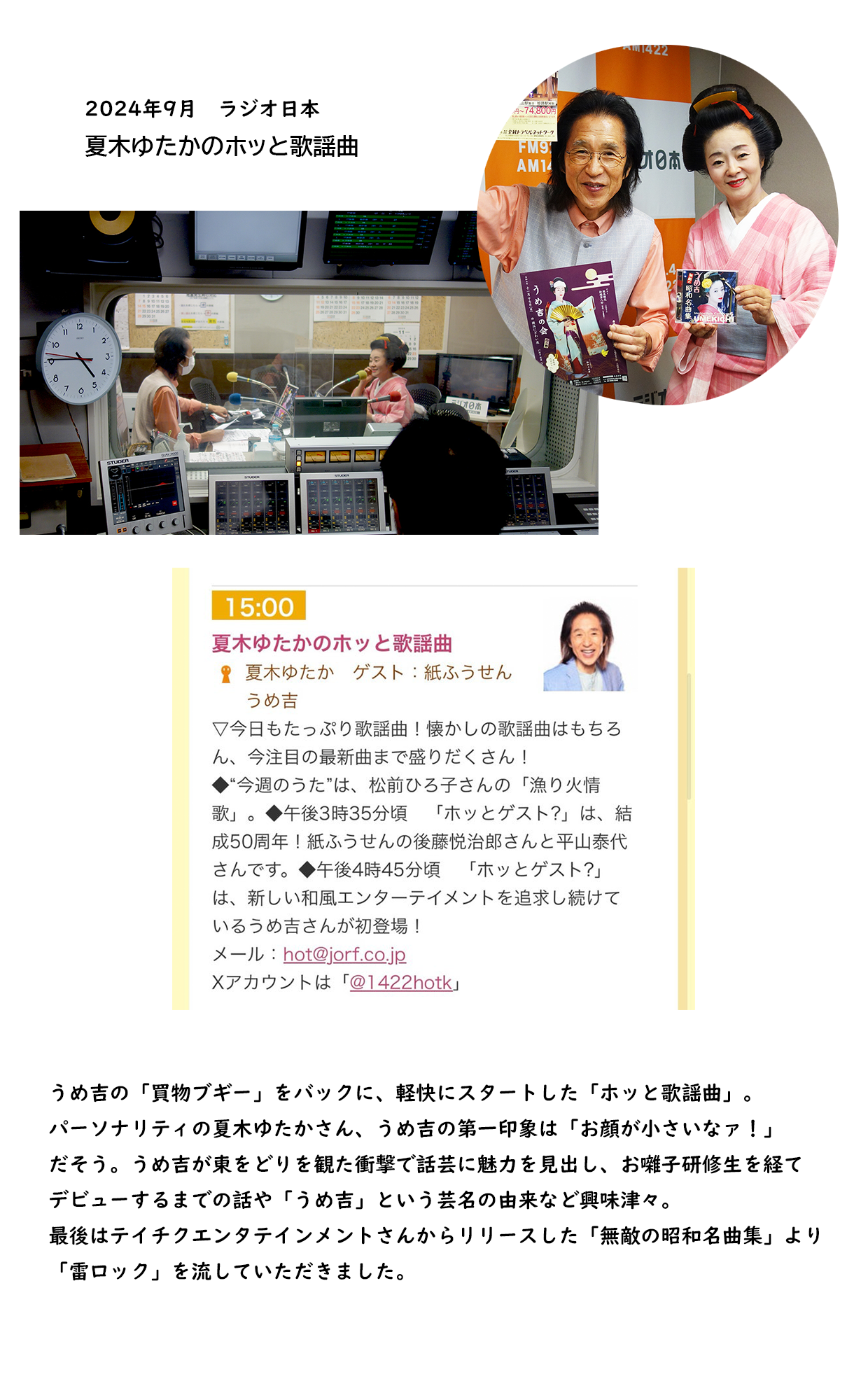 9月 ラジオ日本「夏木ゆたかのホッと歌謡曲」出演